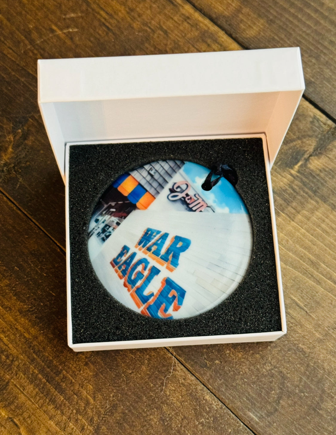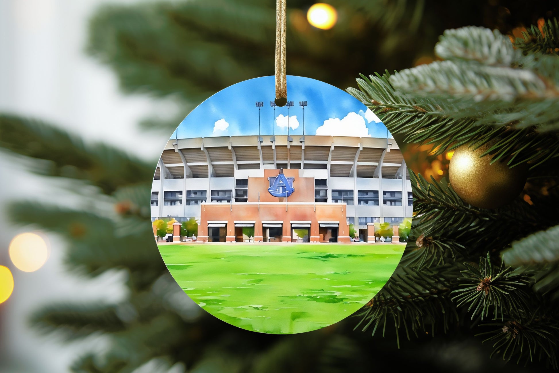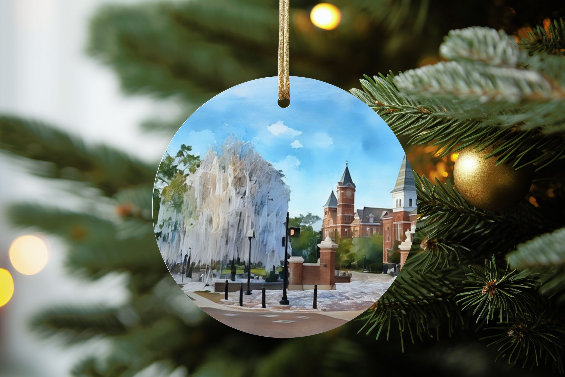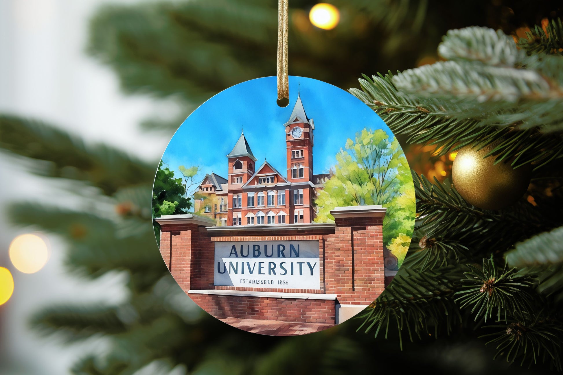Add a touch of holiday charm to your tree with our Auburn landmark watercolor ornaments. These 3 inch ceramic ornament features beautiful watercolor prints of historic Auburn landmarks. Share the gift of school pride with this unique and festive decoration. 'Tis the season for some War Eagle spirit!