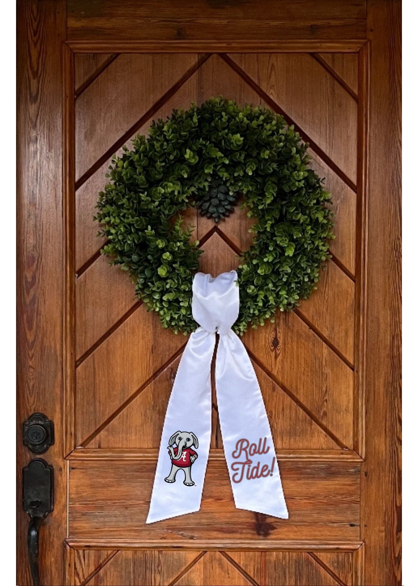 Our wreath sashes are the perfect accessory for any front door wreath. Show your Alabama pride with this decorative wreath sash! This sash is printed with Big Al on one side and the Alabama battle cry "Roll Tide" on the other.
